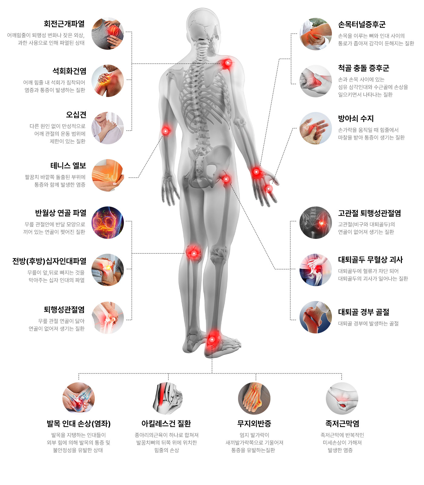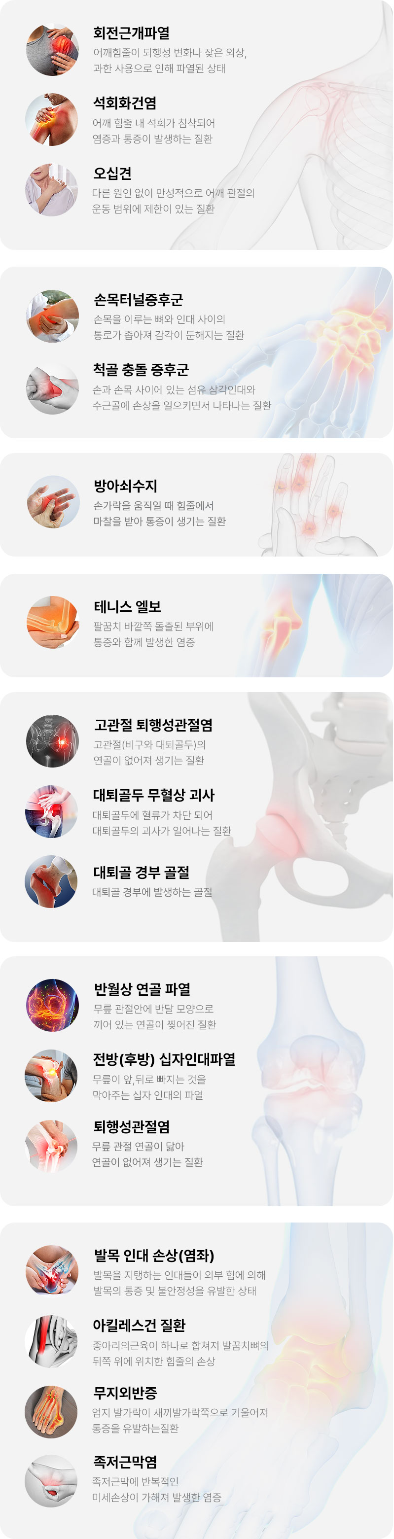 근골격계의 퇴행성 병변 및 힘줄 파열, 관절 주위의 석회화 등 다양한 관절 부위 질환에 적용할 수 있습니다.